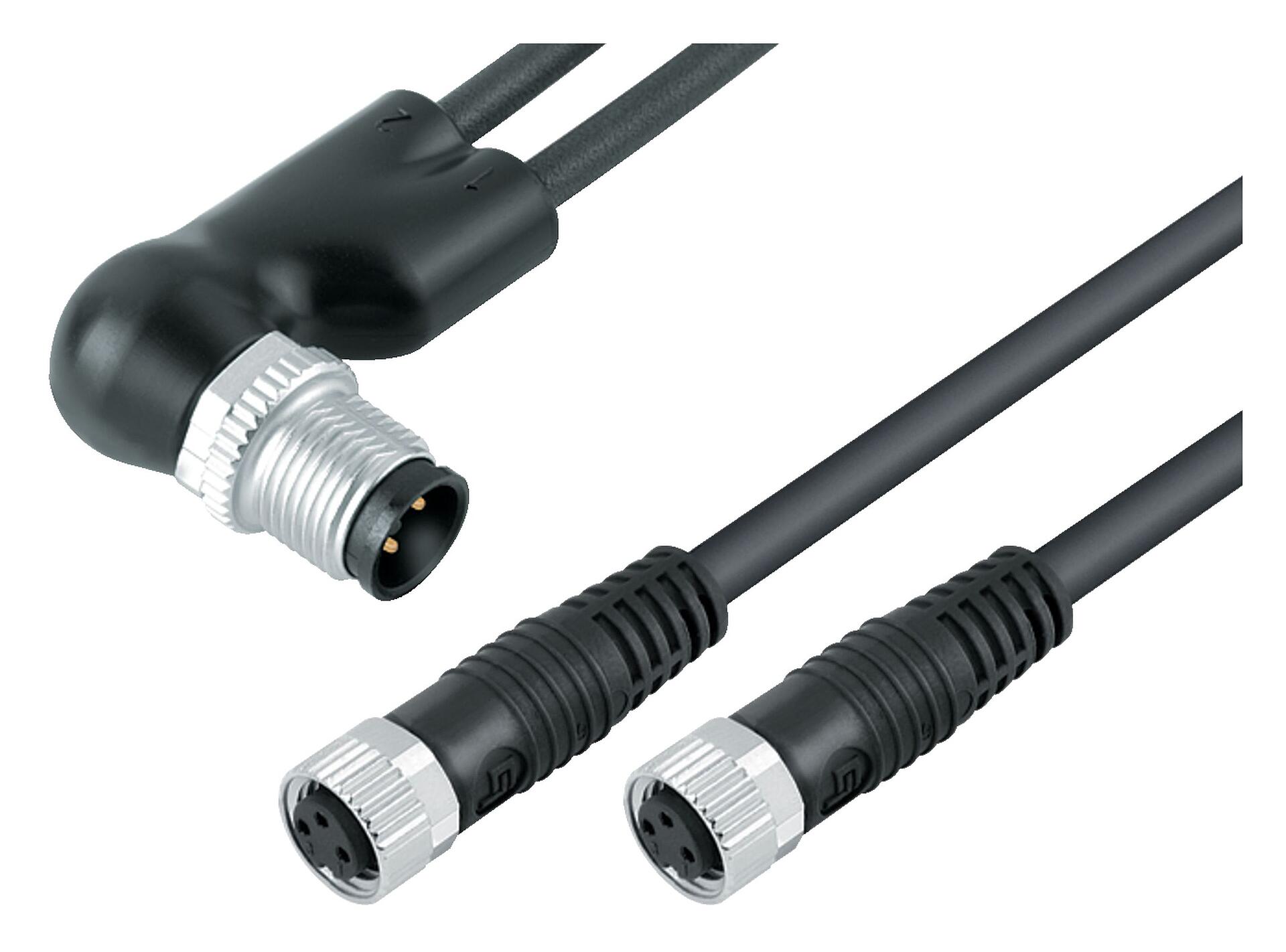 M12/M8 Male angled cable splitter - 2 female cable connectors, Contacts: 4/3, unshielded, moulded on the cable, IP67, UL 2238, PUR, black, 3 x 0.34 mm², 2 m