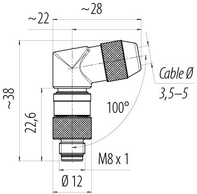 M8 Male angled connector, Contacts: 4, 3.5-5.0 mm, shieldable, solder, IP67, UL 2238