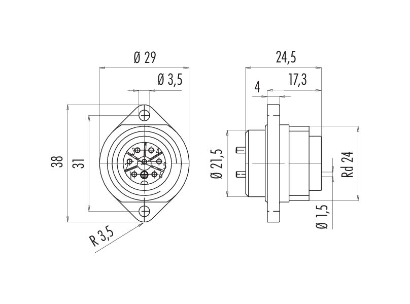 4. RD24 Male panel mount connector, Contacts: 6+PE, unshielded, solder, IP67