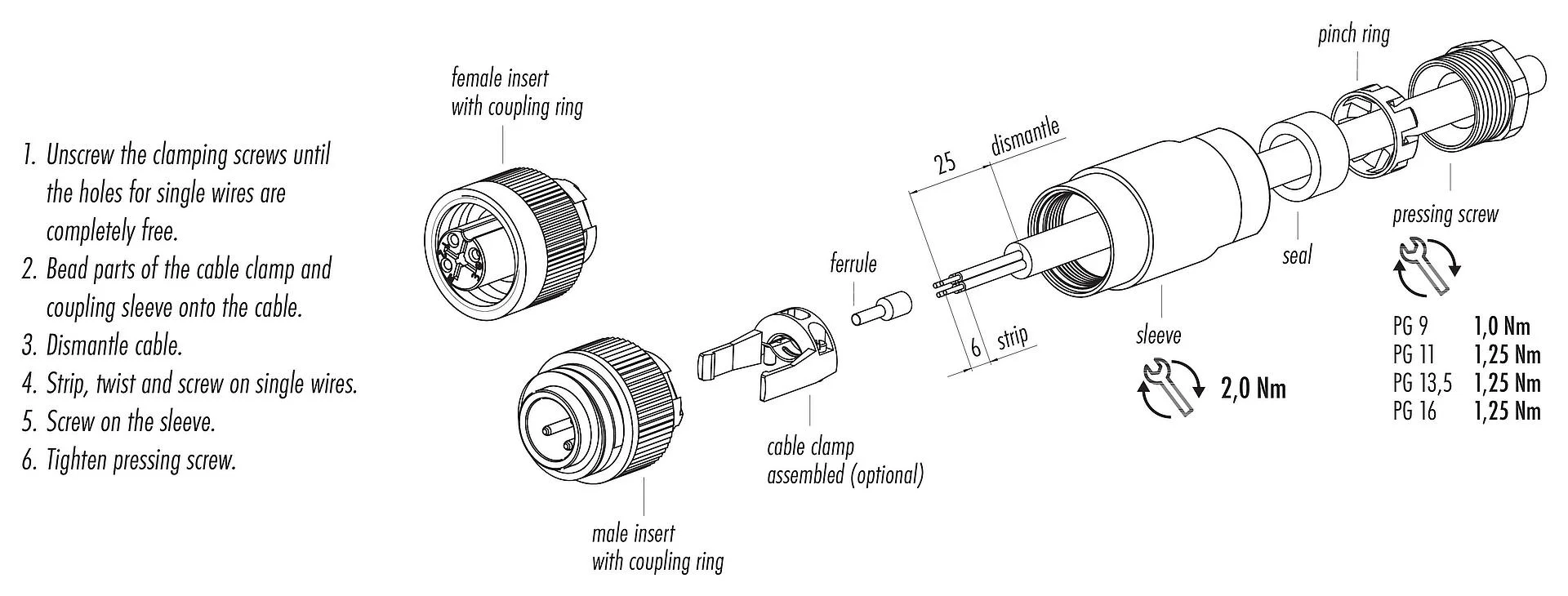 3. To protect against unintentional opening of the connector, the thread between the housing and the connector head must be secured with a suitable cyanoacrylate adhesive when used in circuits with voltages dangerous to the touch. This does not apply to connectors used in SELV and PELV circuits according to IEC 61140 (EN 61140, VDE 0140-1).