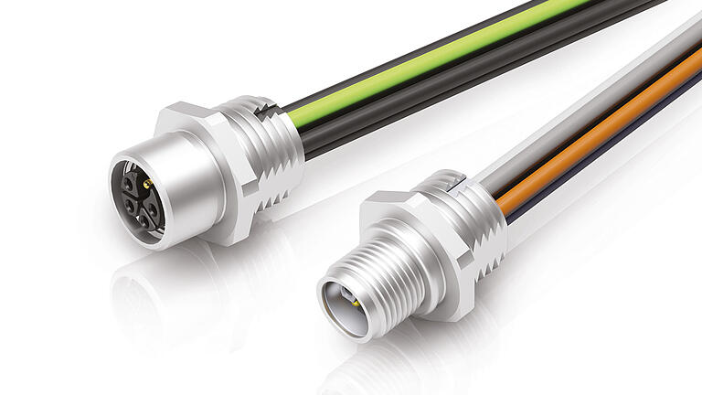 宾德824和823系列5芯K编码(4+PE)和L编码(4+FE功能性接地保护)面板安装连接器 使用M12螺纹锁紧系统,终端接线方式为带导线。K编码和L编码连接器都被设计为适 合线规AWG16和AWG14。对于使用K编码的交流电应用组件,通过PE接地针与螺纹环