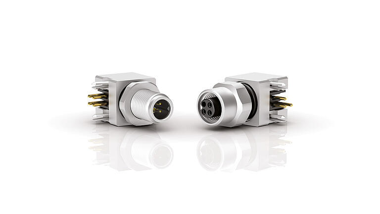 M5弯脚面板安装连接器配备有略微张开的定位销。肉眼几乎看不见,即使在焊接触点之前,这些定位销也能确保对PCB板上产品的最佳保护,防止扭曲。另一个优点是配备更深的O形圈,防水效果更好。当面板安装部件连接时,O形圈受外壳挤压,从而提高密封效果。基本上不可能因过度拧紧而破坏密封圈。M5弯脚面板安装连接器的宽度仅为7.5mm。这明显小于通常连接器的尺寸,这有助于在密闭空间中使用。