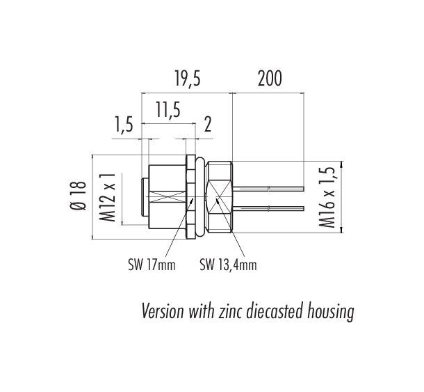 M12 孔头法兰座, 极数: 5, 非屏蔽, 带导线, IP68, UL 2238, M16x1.5, 板前安装