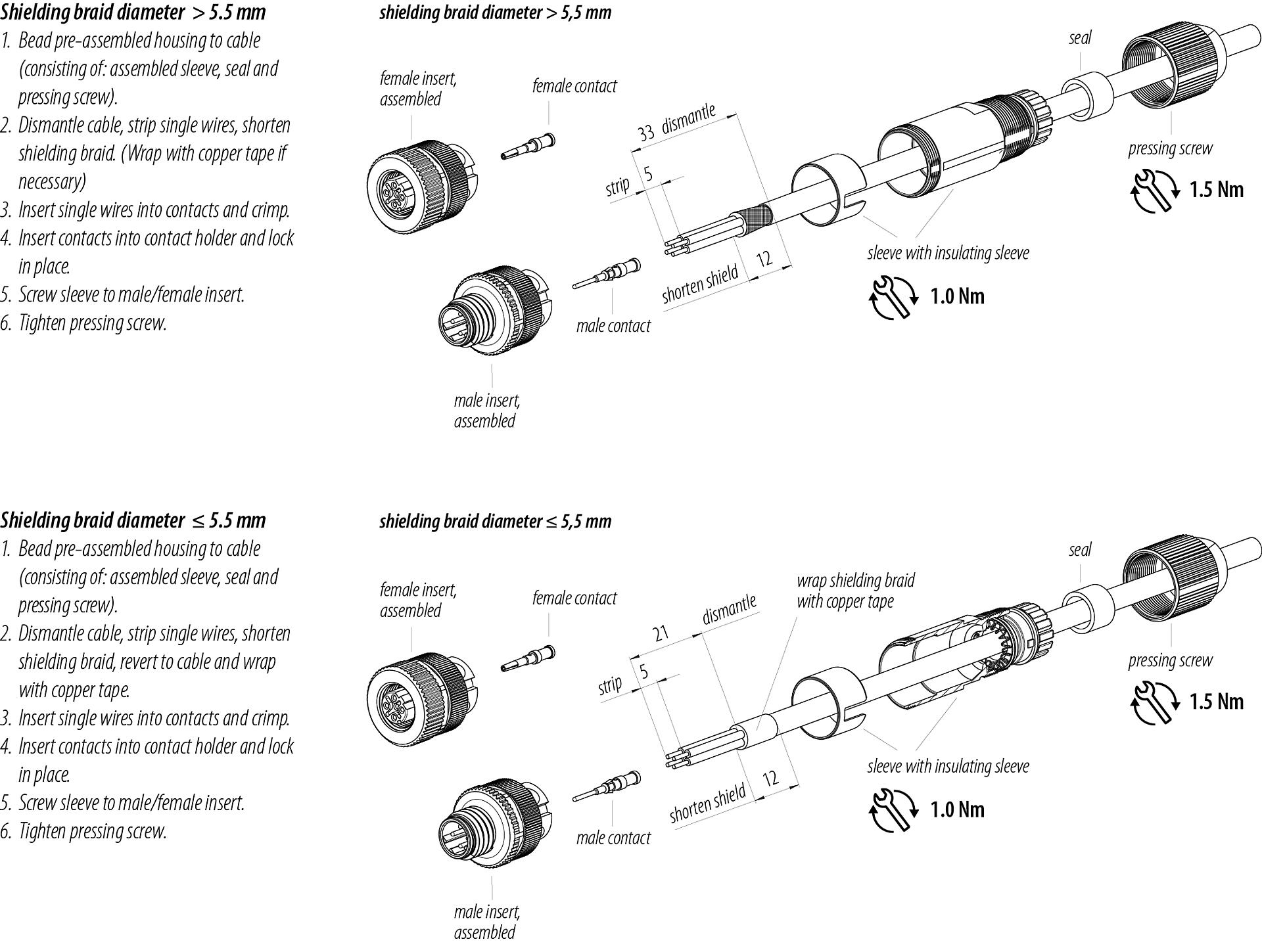 - 为防止意外打开连接器,当使用在有触碰危险的电压的电路中时,必须用合适的氰基丙烯酸酯粘合剂将外壳和连接器头之间的螺纹固定。这不适用于符合IEC 61140 (EN 61140, VDE 0140-1)的SELV和PELV电路中使用的连接器。