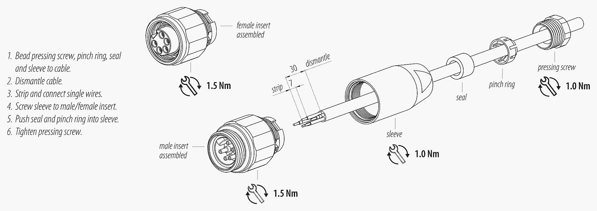 - 为防止意外打开连接器,当使用在有触碰危险的电压的电路中时,必须用合适的氰基丙烯酸酯粘合剂将外壳和连接器头之间的螺纹固定。这不适用于符合IEC 61140 (EN 61140, VDE 0140-1)的SELV和PELV电路中使用的连接器。
