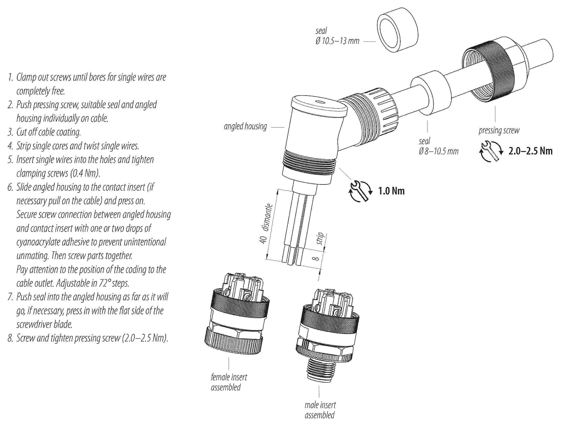 - 为防止意外打开连接器,当使用在有触碰危险的电压的电路中时,必须用合适的氰基丙烯酸酯粘合剂将外壳和连接器头之间的螺纹固定。这不适用于符合IEC 61140 (EN 61140, VDE 0140-1)的SELV和PELV电路中使用的连接器。