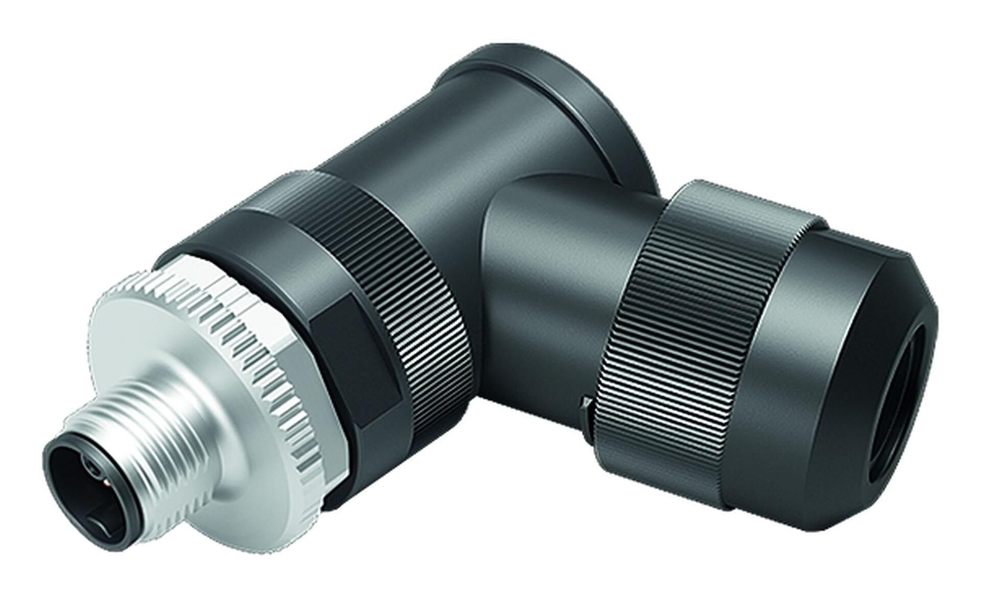 M12 弯角针头电缆连接器, 极数: 4+PE, 8.0-13.0mm, 非屏蔽, 螺钉接线, IP67, UL 2238
