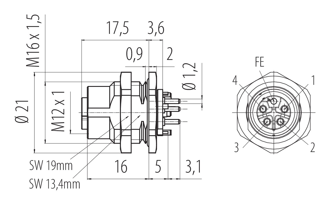 M12 孔头法兰座, 极数: 4+FE, 非屏蔽, THR, IP67, UL 2238, M16x1.5, 後壁安裝