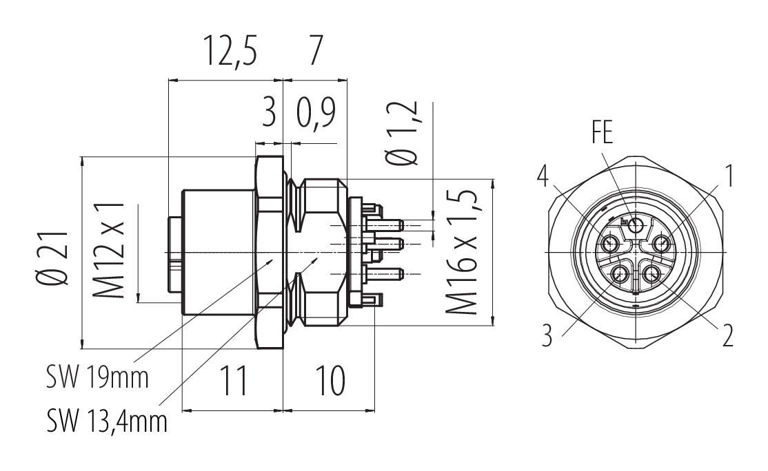 M12 孔头法兰座, 极数: 4+FE, 非屏蔽, THR, IP67, UL 2238, M16x1.5, 板前安装