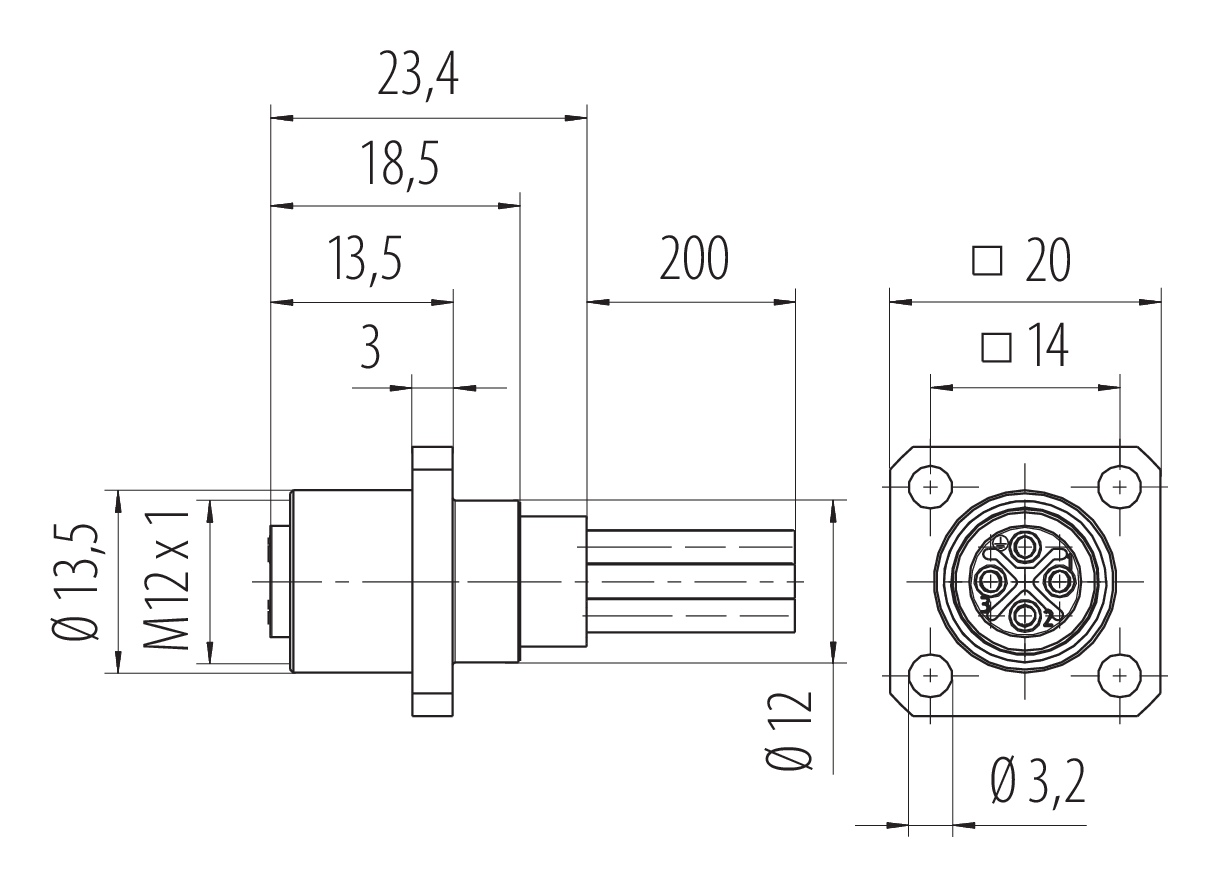 M12 孔头方型法兰座, 极数: 4, 非屏蔽, 带导线, IP40, UL 2238, M3 (4x), 板前安装