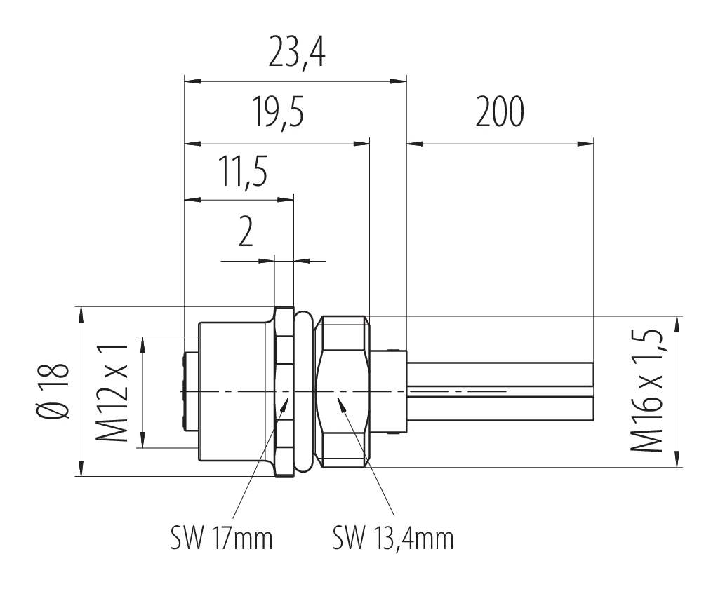 M12 孔头法兰座, 极数: 4, 非屏蔽, 带导线, IP68, UL 2238, M16x1.5