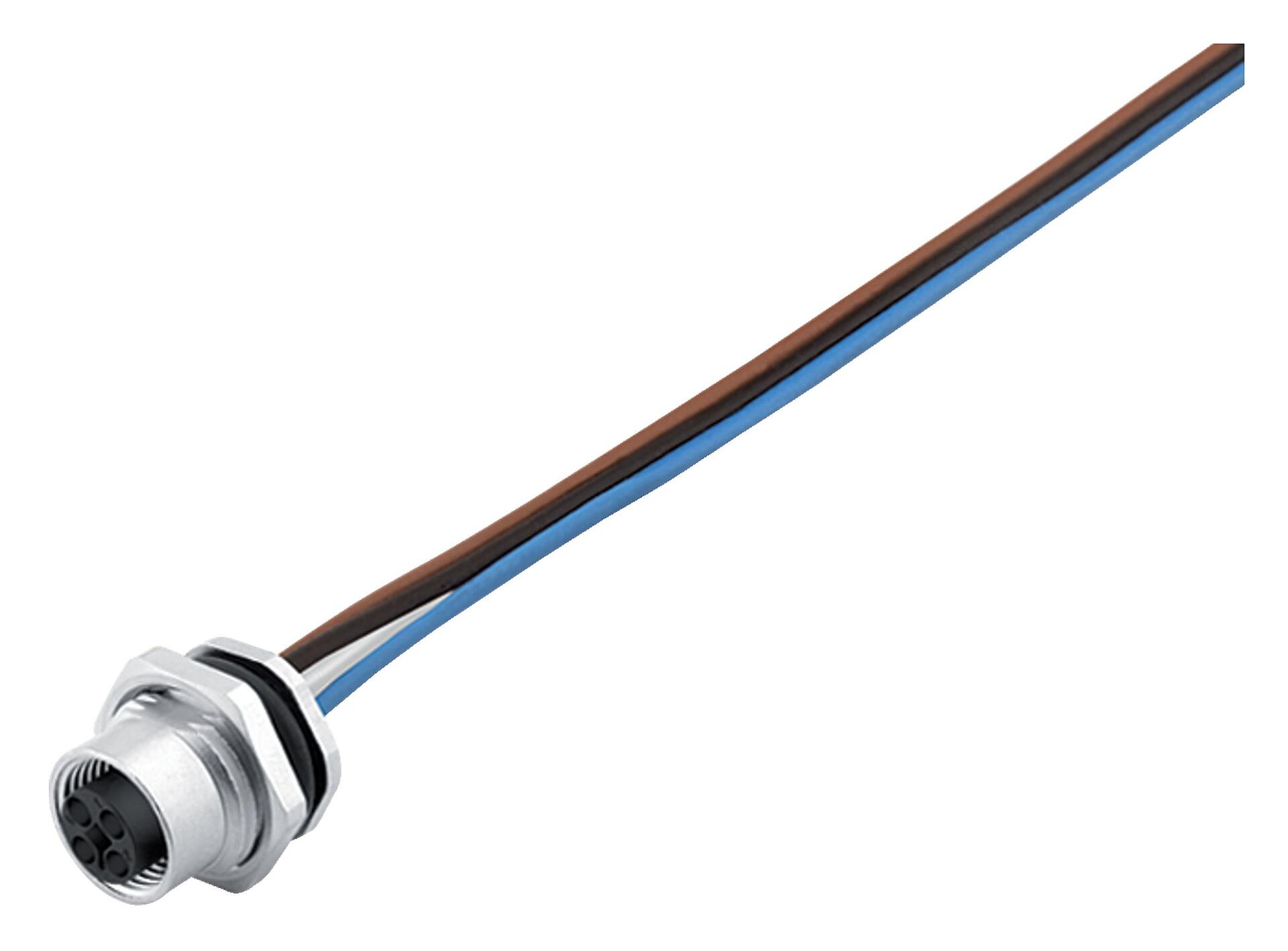 M12 孔头法兰座, 极数: 4, 非屏蔽, 带导线, IP68, UL 2238, M16x1.5, 後壁安裝, 模压成型