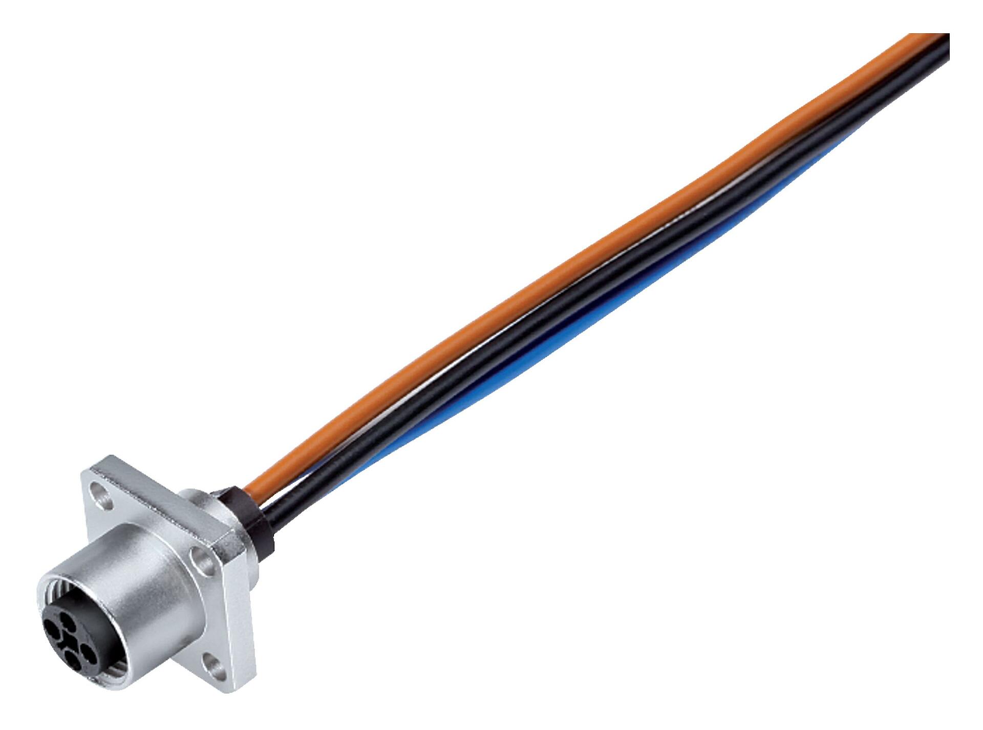M12 孔头方型法兰座, 极数: 4, 非屏蔽, 带导线, IP40, UL 2238, M3 (4x), 板前安装, 模压成型