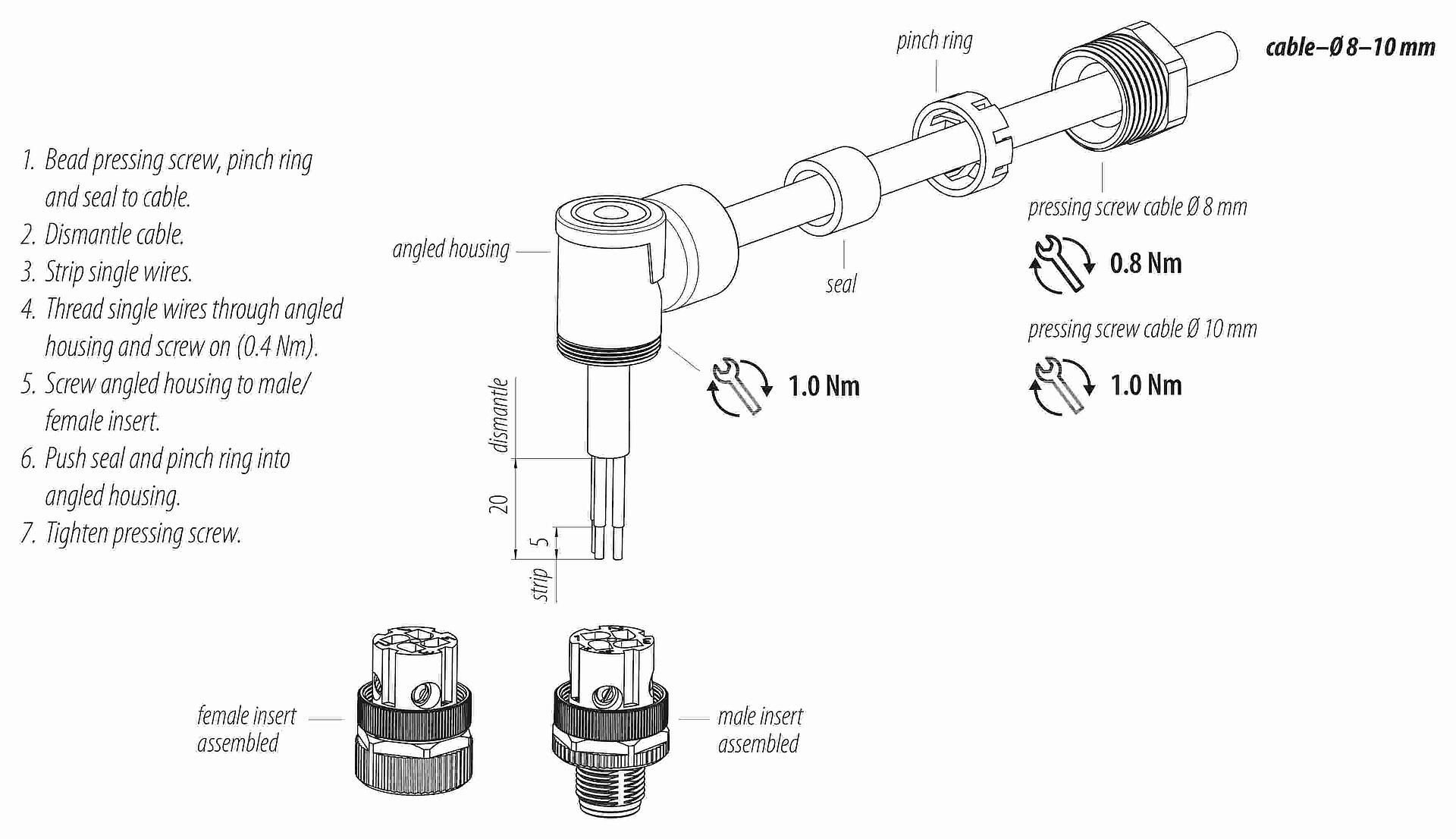 - 为了将电缆接头与设备接头锁紧,螺纹环要用 "手拧紧"(约60 cNm)。