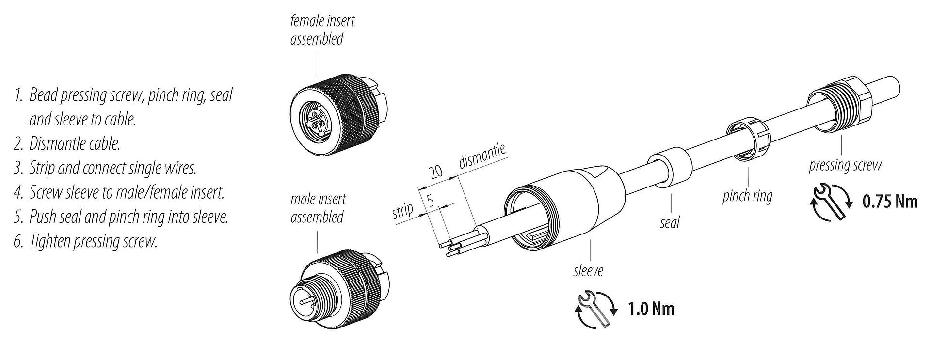 - 为了将电缆接头与设备接头锁紧,螺纹环要用 "手拧紧"(约60 cNm)。