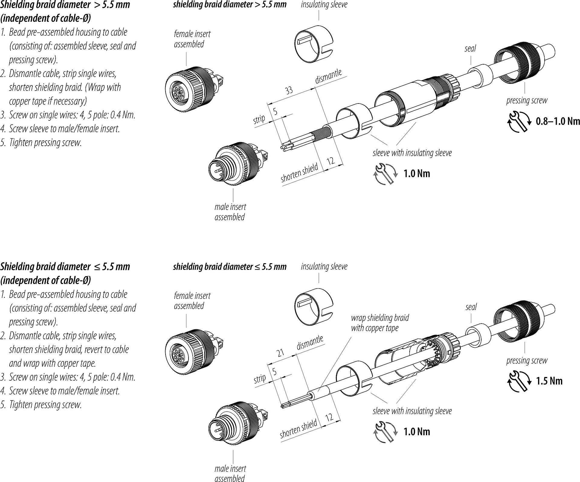 - 为了将电缆接头与设备接头锁紧,螺纹环要用 "手拧紧"(约60 cNm)。