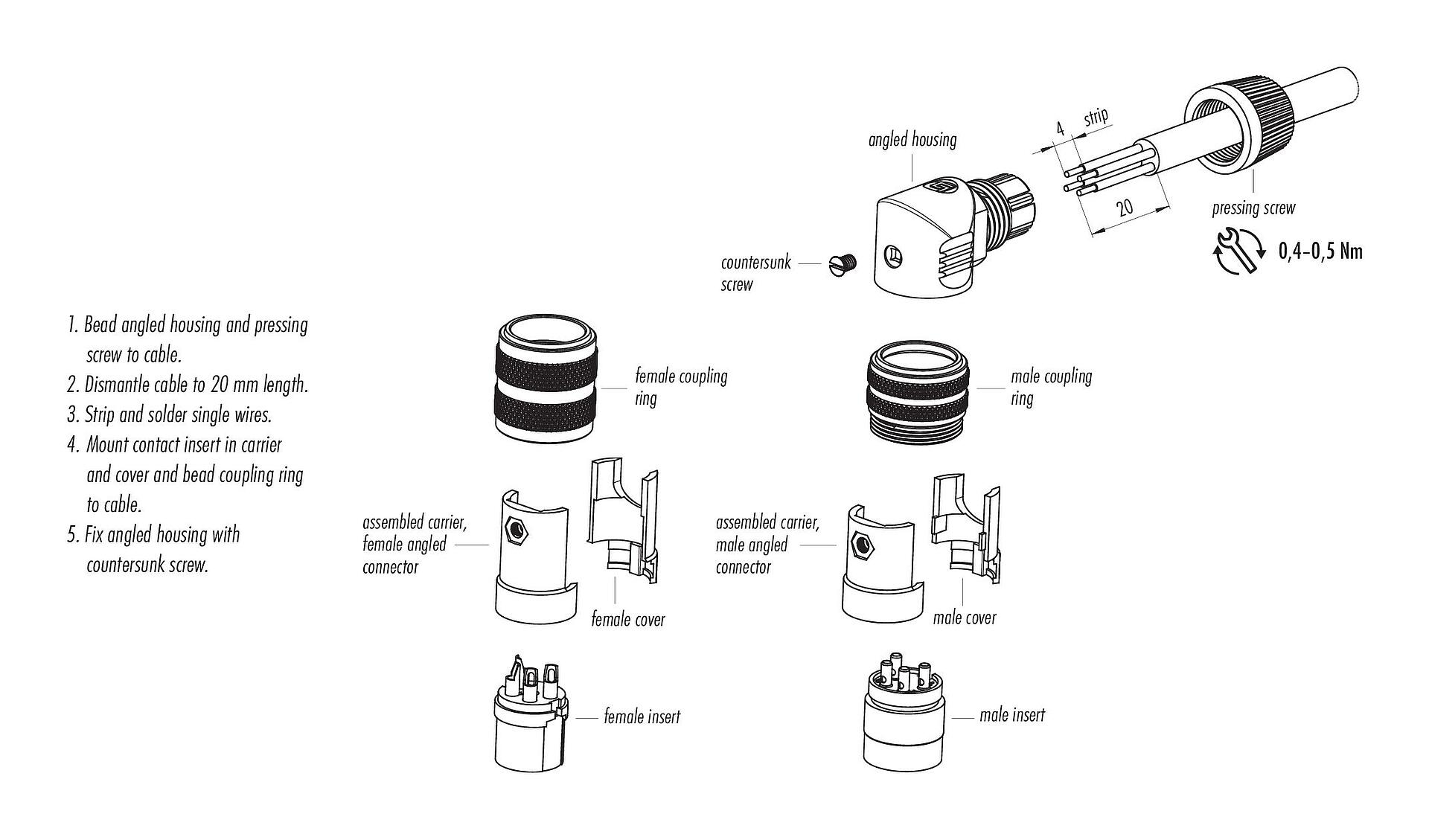- 为防止意外打开连接器,当使用在有触碰危险的电压的电路中时,必须用合适的氰基丙烯酸酯粘合剂将外壳和连接器头之间的螺纹固定。这不适用于符合IEC 61140 (EN 61140, VDE 0140-1)的SELV和PELV电路中使用的连接器。