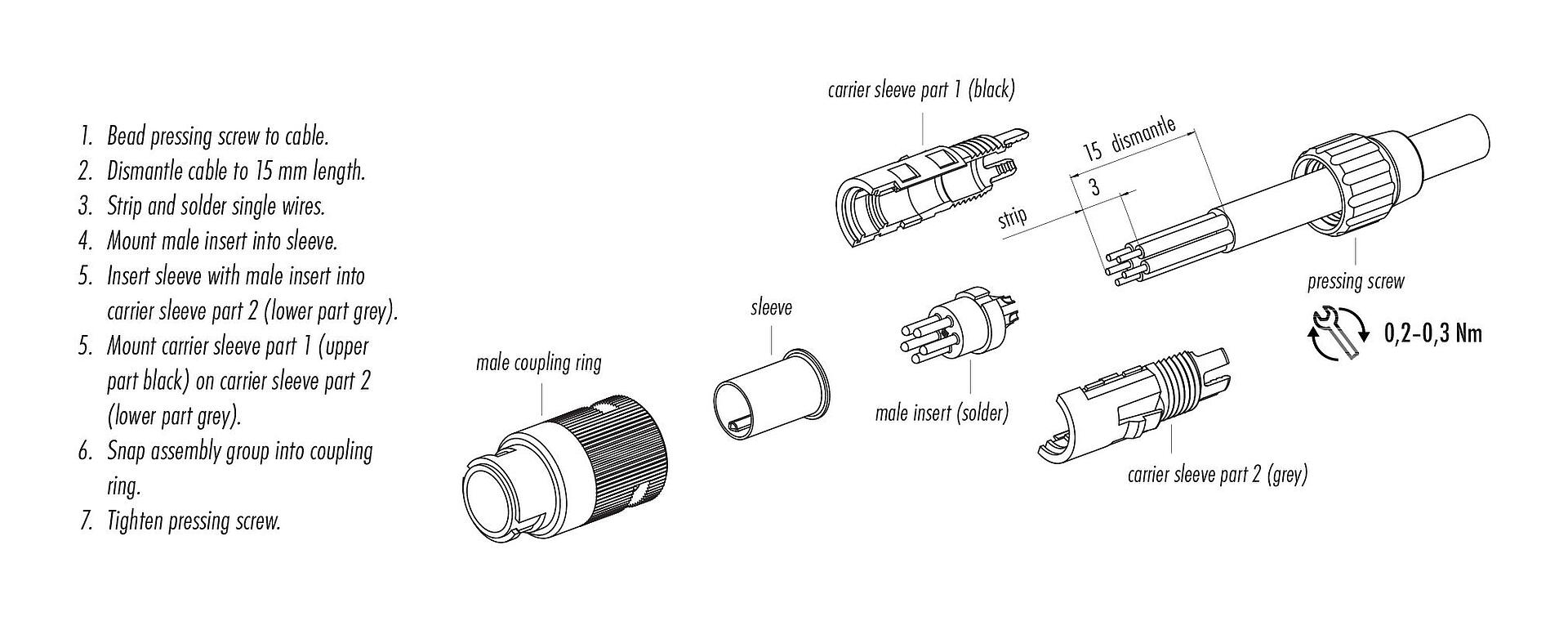 - 为防止意外打开连接器,当使用在有触碰危险的电压的电路中时,必须用合适的氰基丙烯酸酯粘合剂将外壳和连接器头之间的螺纹固定。这不适用于符合IEC 61140 (EN 61140, VDE 0140-1)的SELV和PELV电路中使用的连接器。