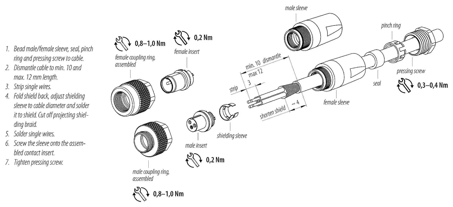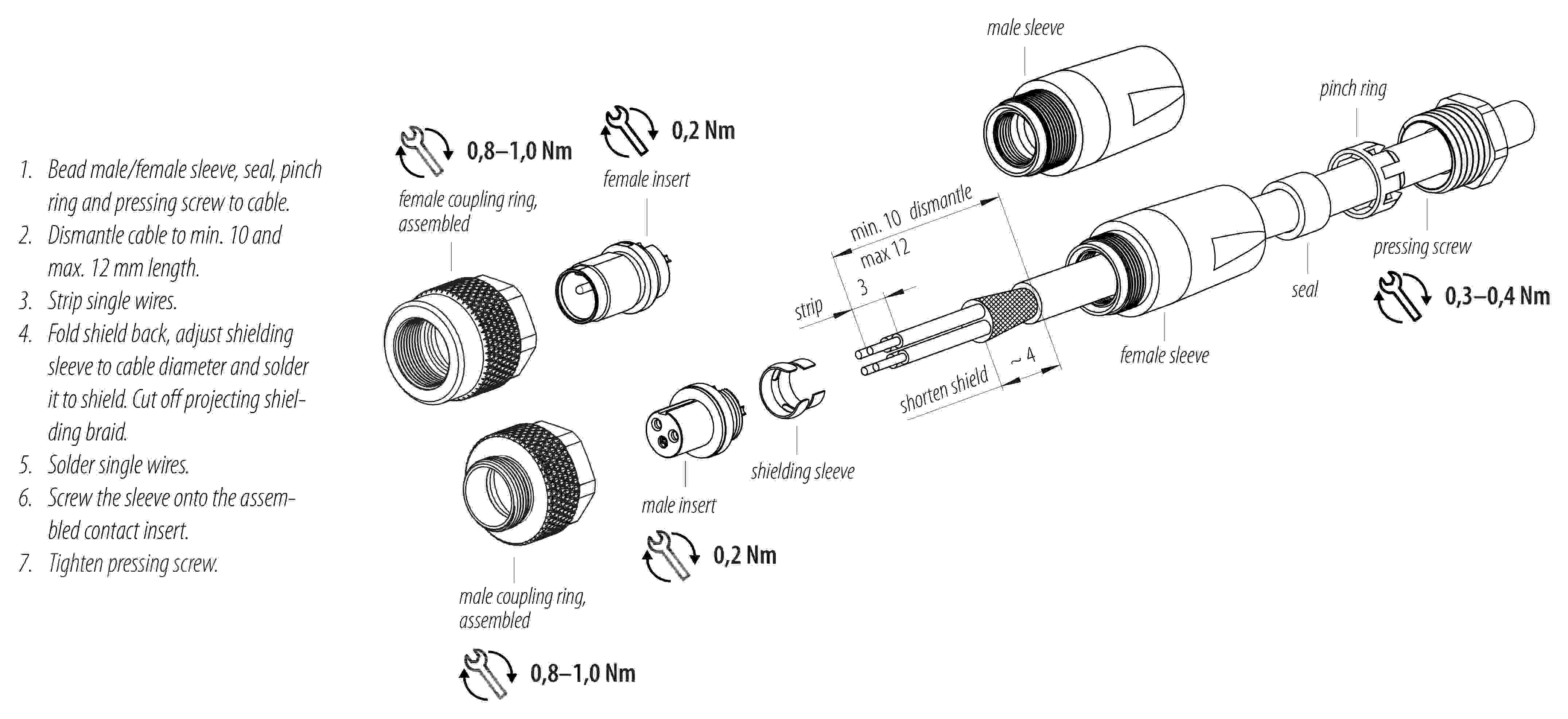 - 为防止意外打开连接器,当使用在有触碰危险的电压的电路中时,必须用合适的氰基丙烯酸酯粘合剂将外壳和连接器头之间的螺纹固定。这不适用于符合IEC 61140 (EN 61140, VDE 0140-1)的SELV和PELV电路中使用的连接器。